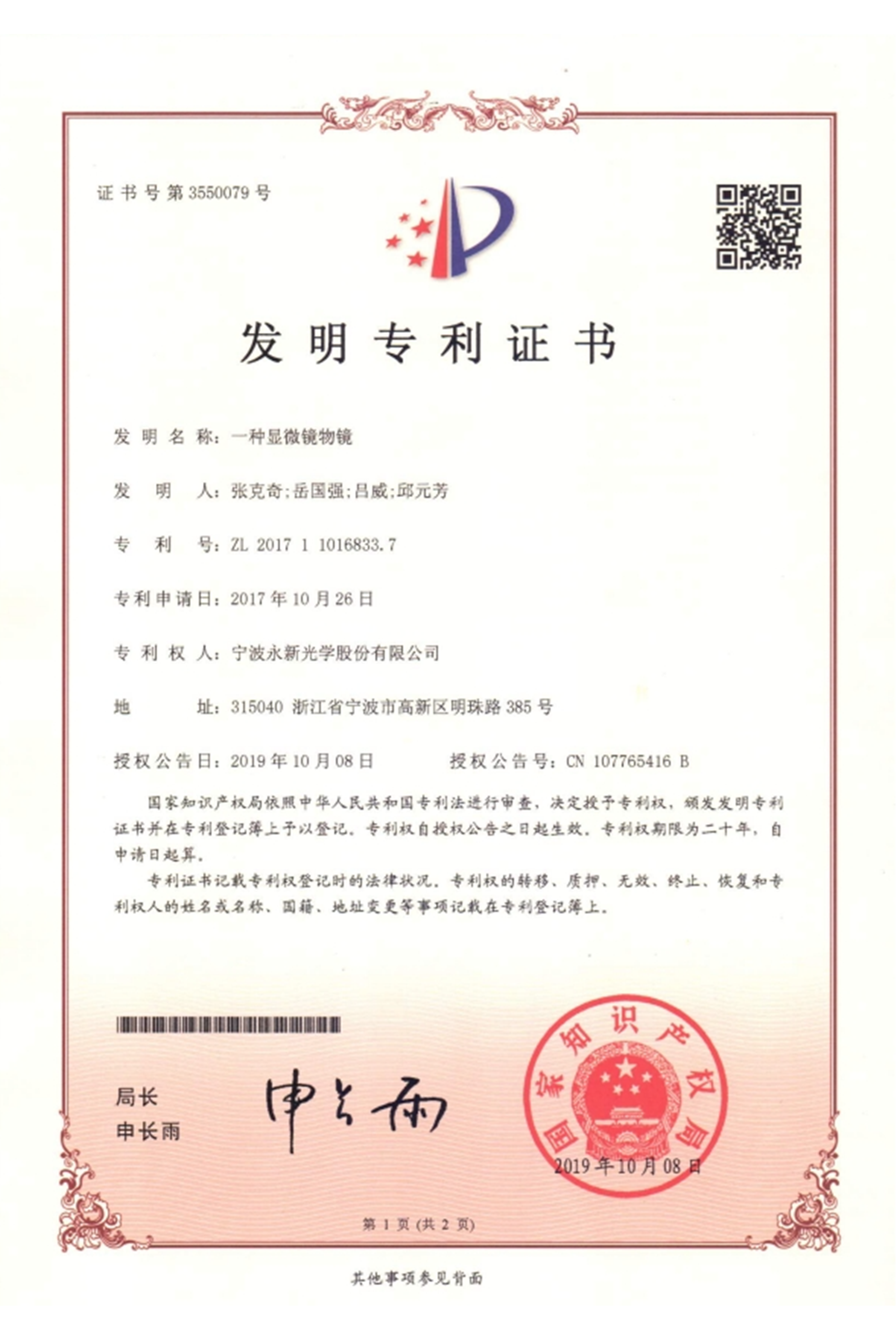 显微镜物镜发明专利证书