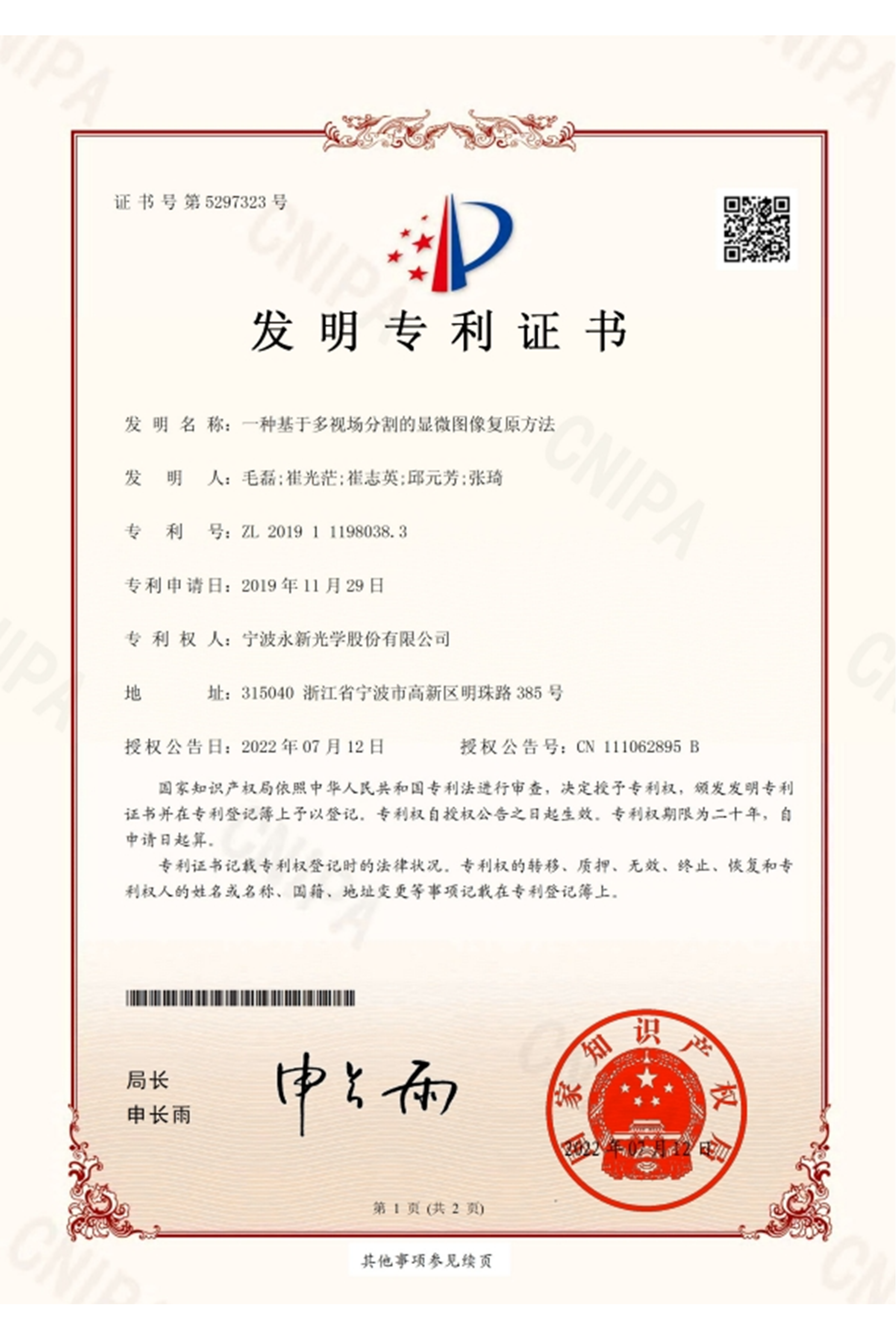显微图像复原方法发明专利证书