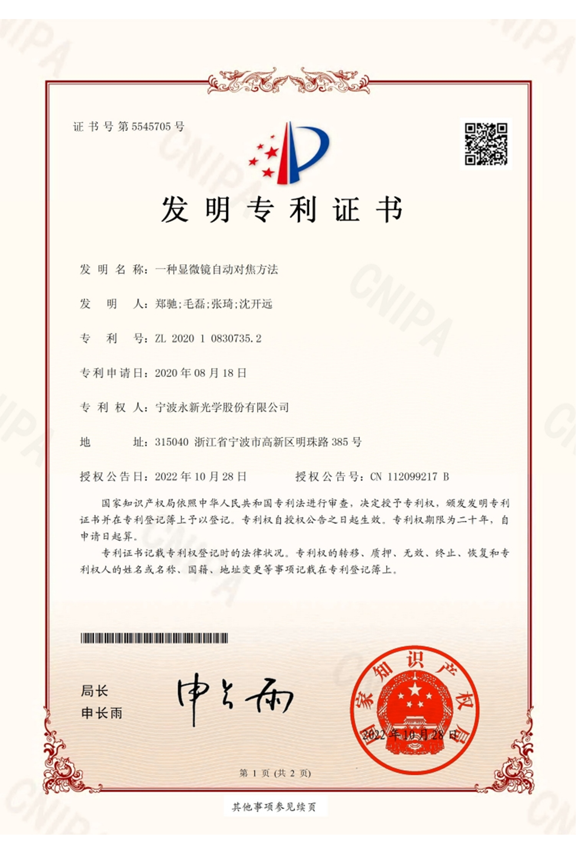 显微镜自动对焦方法发明专利证书
