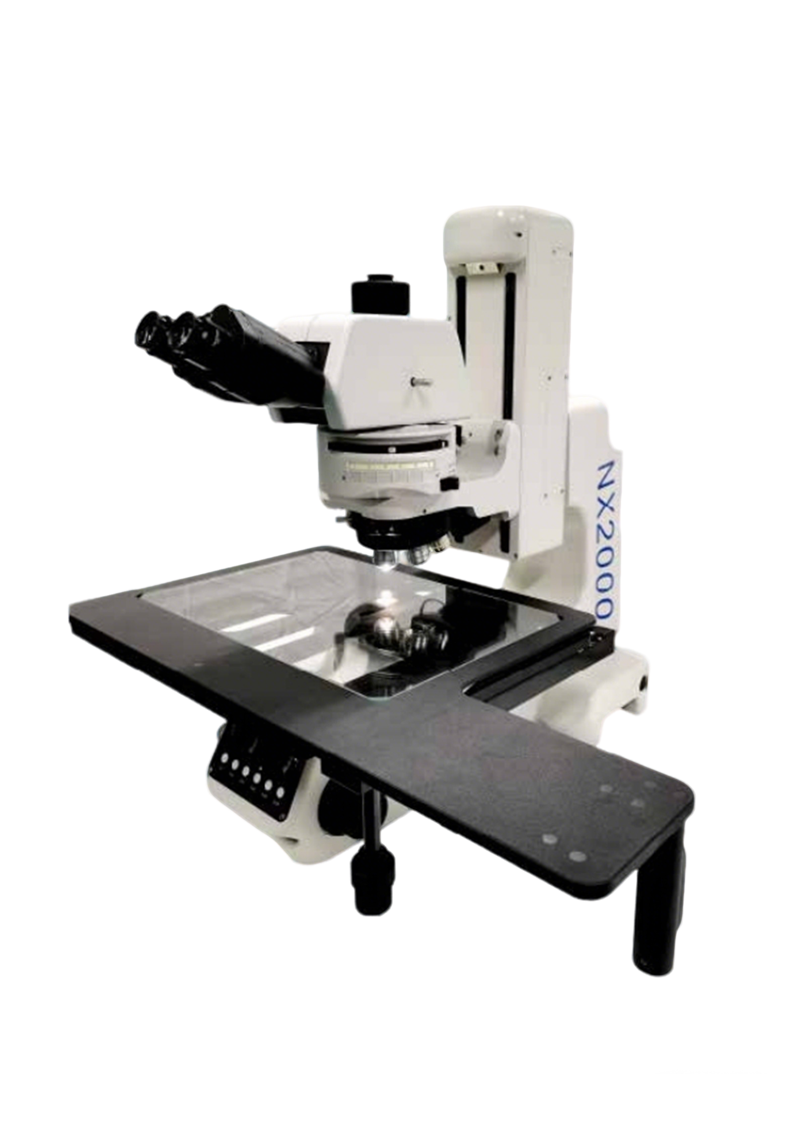 NX2000工业检测显微镜配置表 主体 光学系统 NIS45无限远光学系统 目镜 10X 大视场目镜、线视场 Ф22mm、高眼点、视度可调 调焦系统 粗微动同轴智能变速调焦,粗调 0.1mm/ 圈,微调 0.01mm/ 圈,超大行程(从载物台表面焦点起):向上 193mm,向下 7mm 目镜筒 人体工学铰链式正像三目观察镜筒,目镜 / 端口:100/0、0/100 ,俯角:0-30 度,瞳距调整范围:47-78mm 物镜转换器 电动六孔明暗场转换器,带DIC插槽 物镜 无限远平场半复消色差明暗场金相物镜 载物台 大平台 14" x 12",行程:356 x 305 mm,移动范围:±180 mm(X)x ±130 mm(Y), 可用于 300 毫米晶圆,附试样托架 照明 透射 5W LED 灯,预置中心,光亮度可调,亮度记忆 反射 5W LED 灯,预置中心,光亮度可调,亮度记忆 观察方法 落射 明场 透射 明场,暗场,DIC,简易偏光