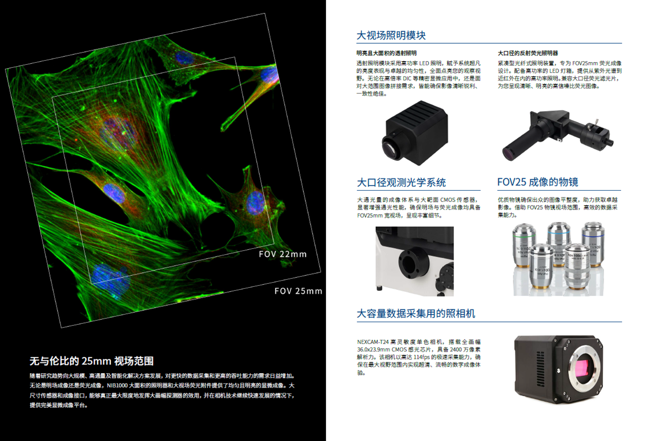 ● 25mm超大视场范围,搭配高速全画幅CMOS相机,为高效成像提供优化解决方案。
